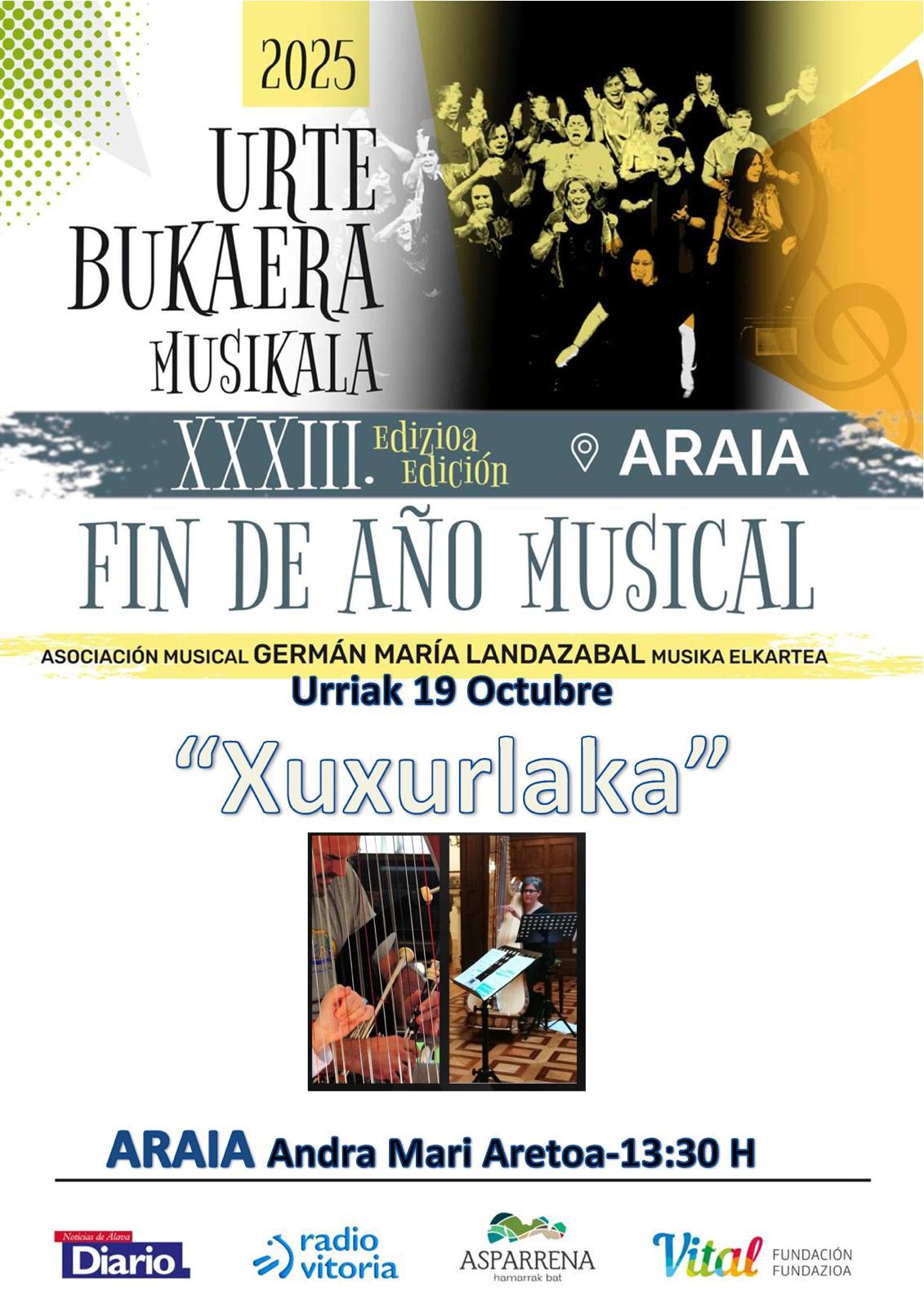 Araiako Urte Bukaera Musikala, Fin de año Musical de Araia 2025 19/10/2025 13:30 Araia Andra Mari Aretoa https://www.google.com/maps/place/Andra+Mari+Aretoa/@42.8895204,-2.3185824,803m/data=!3m2!1e3!4b1!4m6!3m5!1s0xd50233cc9a5694d:0x4af851c3e85efcc!8m2!3d42.8895204!4d-2.3185824!16s%2Fg%2F11cn8tpkm0?entry=ttu&g_ep=EgoyMDI1MTAwOC4wIKXMDSoASAFQAw%3D%3D